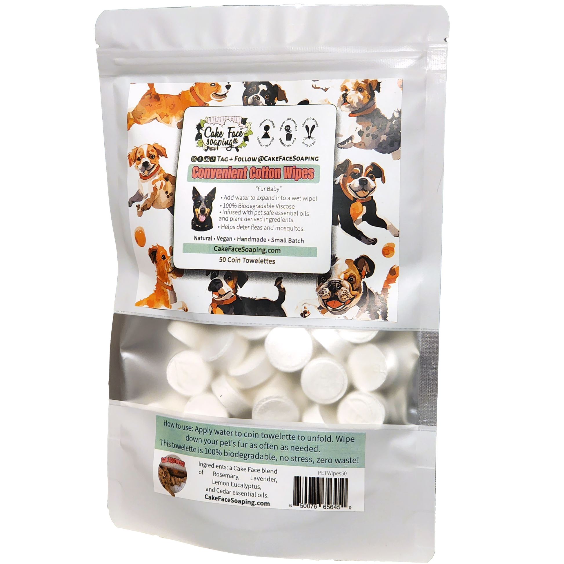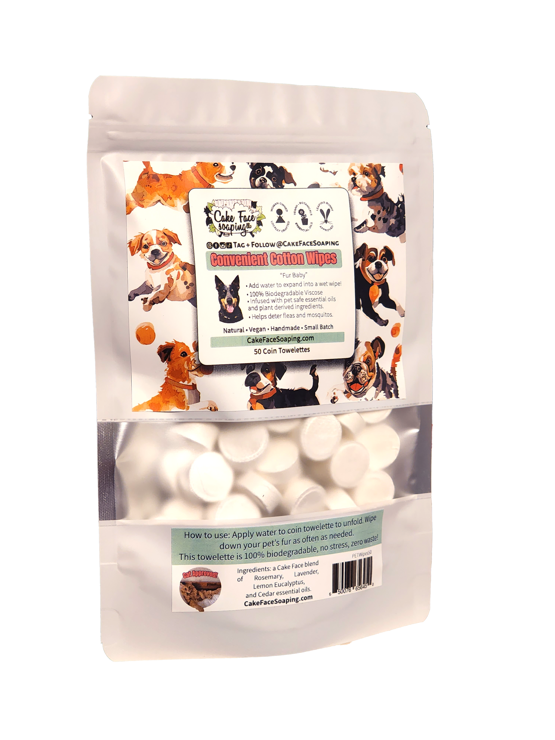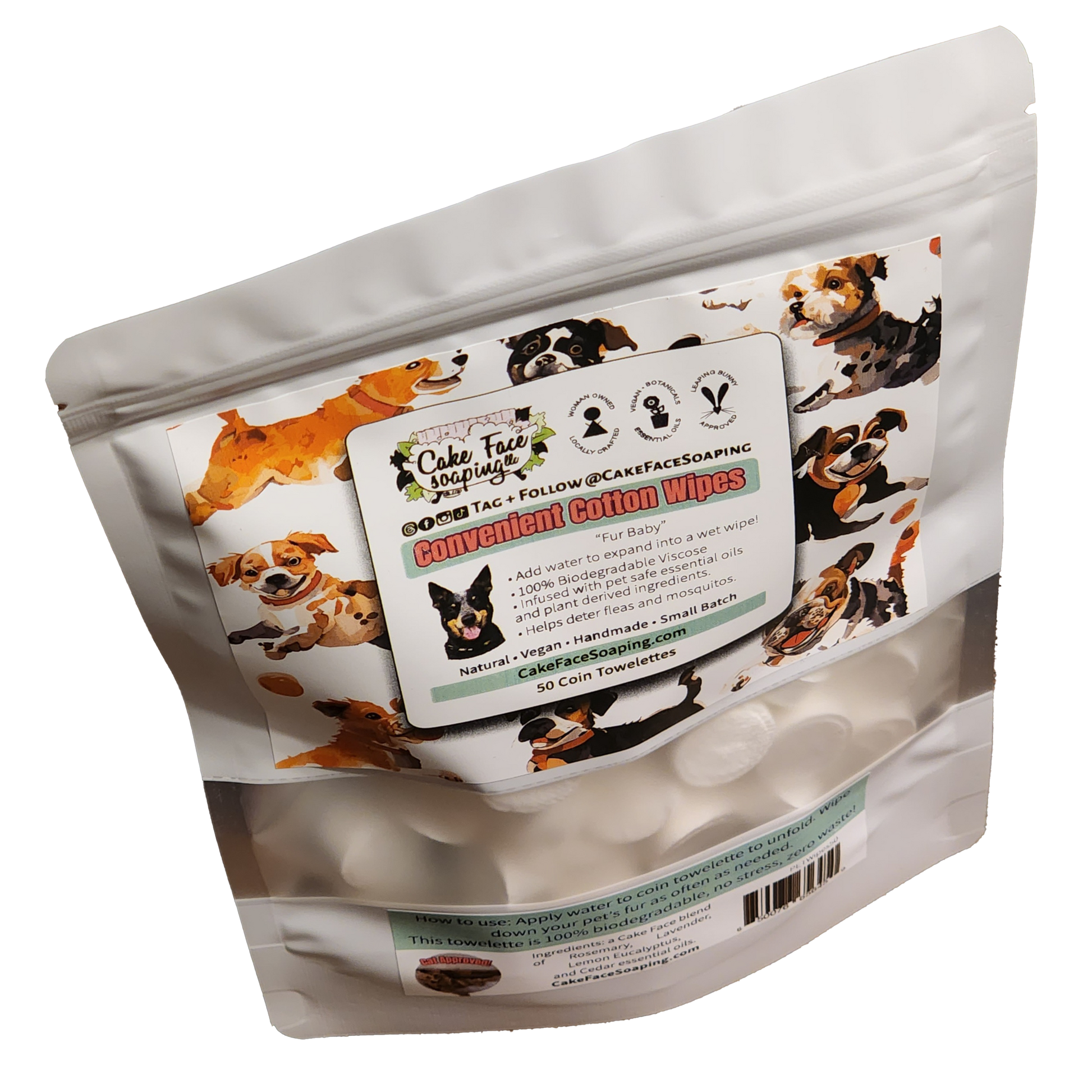 Our Fur Baby Convenient Cotton Wipes are the perfect solution for quick clean-ups, post-walk freshening, or anytime your pup needs a little TLC. Made with 100% biodegradable viscose, these luxurious towelettes are infused with our signature "Fur Baby" essential oil blend featuring rosemary, lavender, lemon eucalyptus, and cedar - all carefully selected for their pet-safe properties and amazing scent.